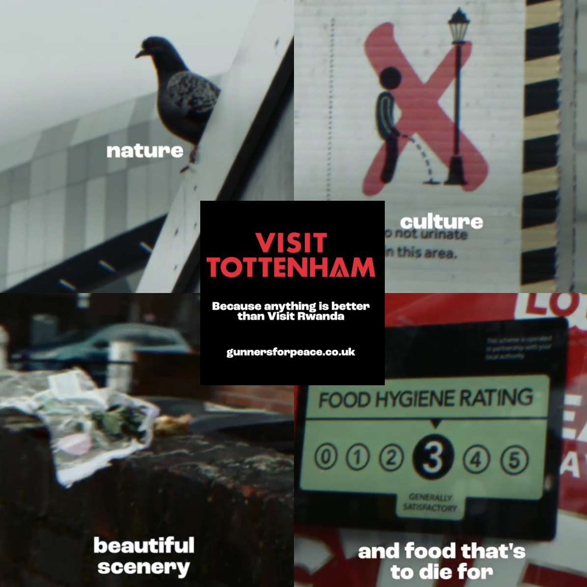 Navijači londonskega nogometnega kluba Arsenal, znani kot Gunners ali Topničarji, protestirajo proti sponzorstvu Visit Rwande in pozivajo k prekinitvi pogodbe s klubskim sponzorjem za naslednjo sezono. Podporniki kluba, združeni pod imenom Gunners For Peace, so na družbenih omrežjih tako objavili sarkastični promocijski video Visit Tottenham. V Tottenhamu domuje Arsenalov glavni nasprotnik Tottenham Spurs, toda kot z izbiro destinacije poudarjajo navijači Arsenala, je karkoli boljša izbira od Ruande.