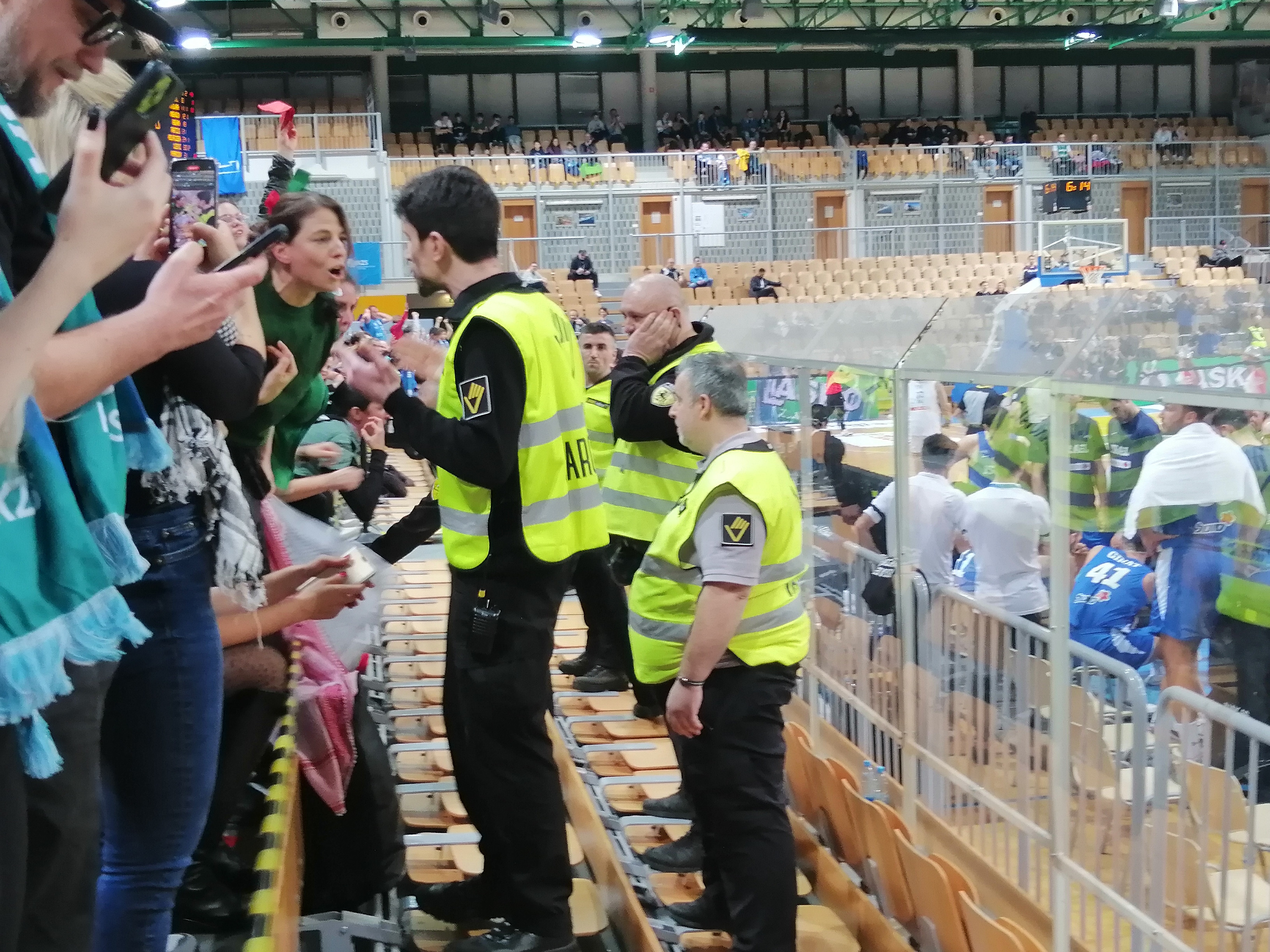 Varnostniki, ki jih je najela košarkarska zveza, so skušali kar se da natančno izpolnjevati prepovedi. Listov papirja z naslikanimi lubenicami, simbolom podpore Palestini, varnostniki niso zasegli. Prav tako so dopuščali mahanje z rdečimi listi papirja, ki so predstavljali rdeče kartone za izraelski genocid. Okrog deset palestinskih zastav, ki so jih protestniki uspeli prešvercati v dvorano, so varnostniki zasegli, kaj hitro jim je to uspelo. Transparente s slogani, kot je »Slovenija proti genocidu«, prav tako. To jih je tako zamotilo, da je Franci Kek uspel s kefijo oziroma ruto skočiti na igrišče.