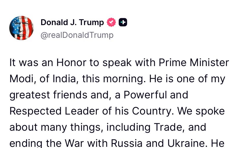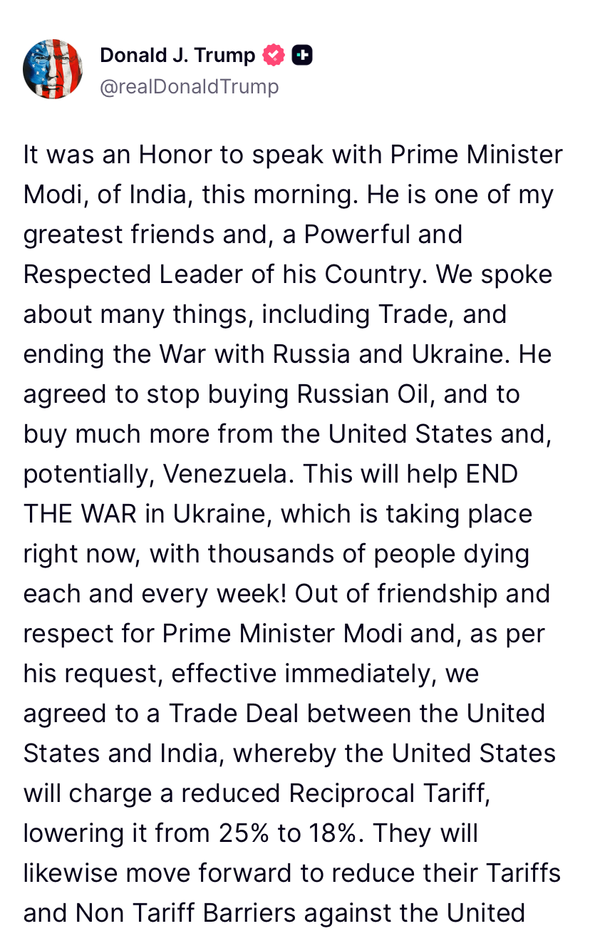 Ameriški predsednik Donald Trump je na svojem družbenem omrežju Truth Social napovedal znižanje carin na uvoz iz Indije s 50 na 18 odstotkov. Čeprav je dogovor, ki ga državi sicer še nista uradno podpisali, kasneje potrdila tudi Indija, ta prinaša več vprašanj kot odgovorov. Trump je sklenitev dogovora pojasnil, češ da bo carine znižal, saj je indijski premier Narendra Modi pristal na pogoj, da bo Indija namesto ruske kupovala ameriško in venezuelsko nafto. Tako ni zares znano, kdaj naj bi Indija prenehala kupovati rusko nafto, koliko nafte lahko Indija dobi iz drugih virov, da nadomesti izpad iz Rusije, ali kdaj bodo Združene države znižale carine.