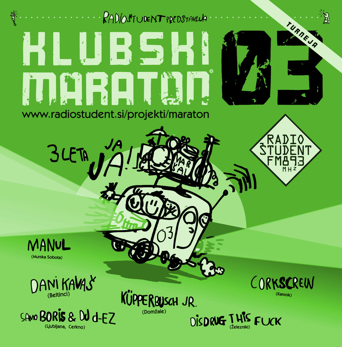 Na že 3. zaporednem Klubskem maratonu je žirija Glasbene redakcije Radia Študent je izmed XX prispelih prijav na natečaj Klubski maraton 2003 izbrala 6 glasbenih izvajalcev, ki so se v letu 2003 udeležili najdaljše in najglasnejše klubske glasbene turneje po Sloveniji.