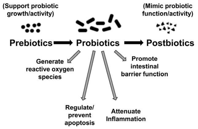 V črevesju najdemo naravno prisotne prebiotike in probiotike. Začeti moramo z ločitvijo med njimi. Prebiotiki so hrana za probiotične bakterije in skupaj z njimi predstavljajo neko naravno zaščito organizmom. Ta zaščita deluje na več nivojih. Prvič, probiotiki izločajo zaviralne molekule, ki preprečujejo prekomerno naseljevanje patogenov. Probiotiki lahko tudi zasedejo mesta patogenom in jim jemljejo prostor. Če se patogen sploh ne more vezati na steno črevesja, je to že velik plus za organizem. Prav tako probiotiki jemljejo hrano patogenom, hkrati pa absorbirajo toksine, ki jih patogeni izločajo. Posredna prednost probiotikov pa je tudi aktivacija imunskega sistema, kar pomeni, da se naše telo lažje sooči s patogenom.