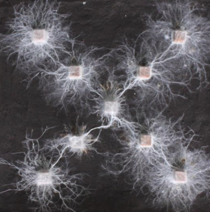 Raziskovalna skupina je suhe lesene kocke v velikosti kubičnega centimetra postavila v dve različni posodi. V prvi posodi je bilo osem kock, postavljenih v krogu. V drugo posodo je skupina razporedila devet kock v obliki črke X. Raziskovalke in raziskovalci so na kocke nacepili glivo, imenovano Phanerochaete velutina. Obe posodi so inkubirali 116 dni in spremljali razrast nitkastih struktur oziroma hif, ki sestavljajo micelij.