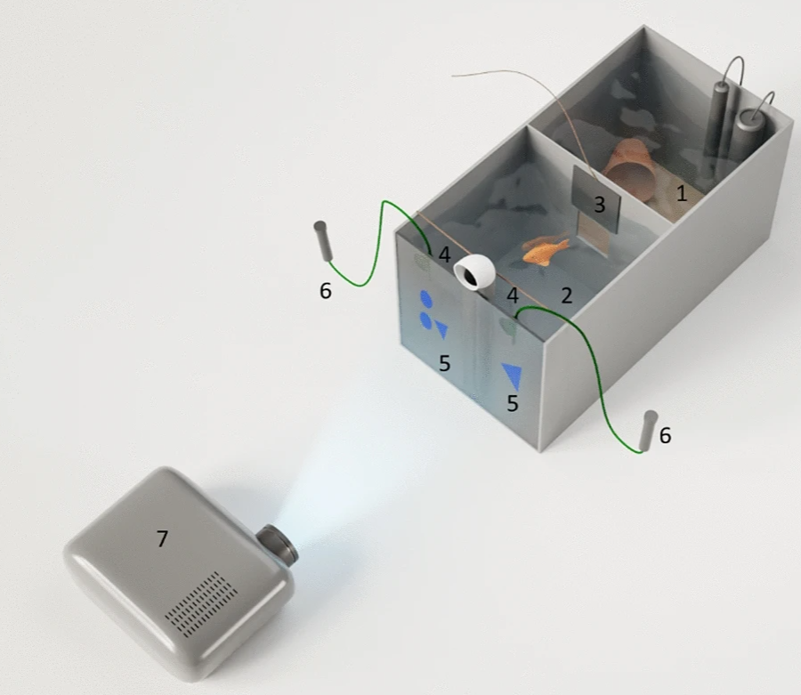Za omenjeni poskus je raziskovalna skupina naključno izbrala osem ostrižnikarjev in osem morskih bičev, ki so jih testirali individualno. V prvem koraku je bilo treba žival sploh naučiti računanja. Ribi so najprej pokazali določeno število likov izbrane barve. Če so bili liki obarvani modro, je to pomenilo »dodaj eno«, če pa so bili obarvani rumeno, je to pomenilo »odštej eno«. Ko so jim prikazali prvotno sliko, na primer štiri rumene kvadrate, so jo odstranili. Nato so živali prikazali dve novi sliki – eno s petimi in eno s tremi kvadratki. Če so priplavale do pravilne slike, torej do treh rumenih kvadratov, so jih nagradili s hrano. Če pa so priplavale do napačnega odgovora, hrane niso dobile. Sčasoma so se naučile povezovati modro barvo s povečanjem za eno v količini, prikazani na začetku, in rumeno številko z zmanjšanjem.