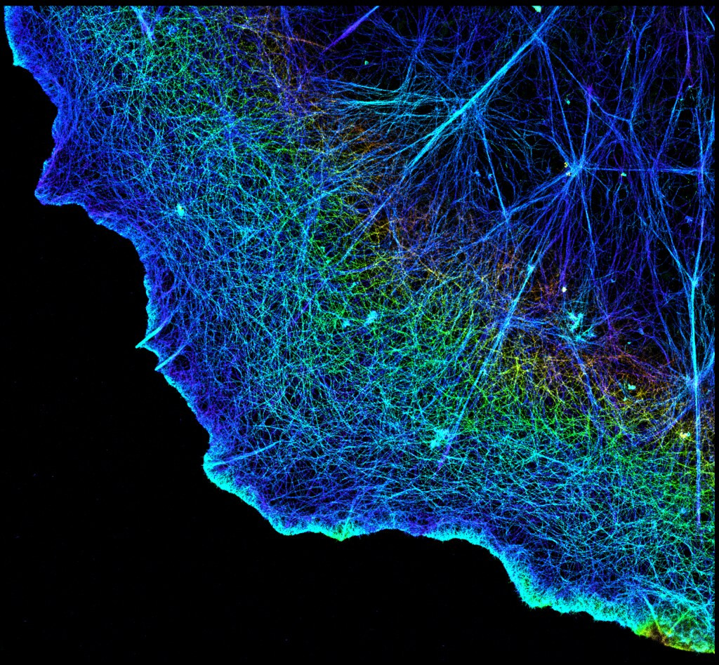 Naslovna fotografija prikazuje mikroskopsko sliko aktinskih filamentov v celici.