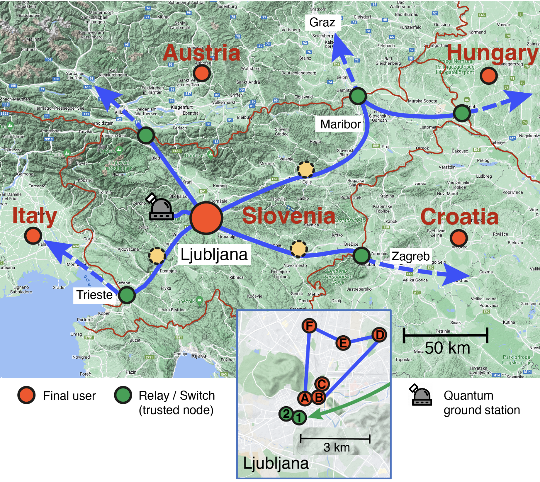 Naslovna slika: Zemljevid načrtovanega kvantnega komunikacijskega omrežja, vir: SIQUID FMF